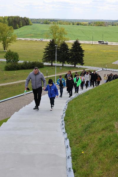 Возвращаясь, дети восхищались увиденным и делились впечатлениями, что они самостоятельно поднялись на высоту 35 метров, прошли по бетонным лестницам 241 ступеньку к вершине Кургана, где размещается скульптурная композиция – 4 штыка, которые опоясывает кольцо - барельефное изображение советских солдат, партизан. На внутренней стороне кольца–надпись: «Армии Советской, Армии-освободительнице - Слава!».