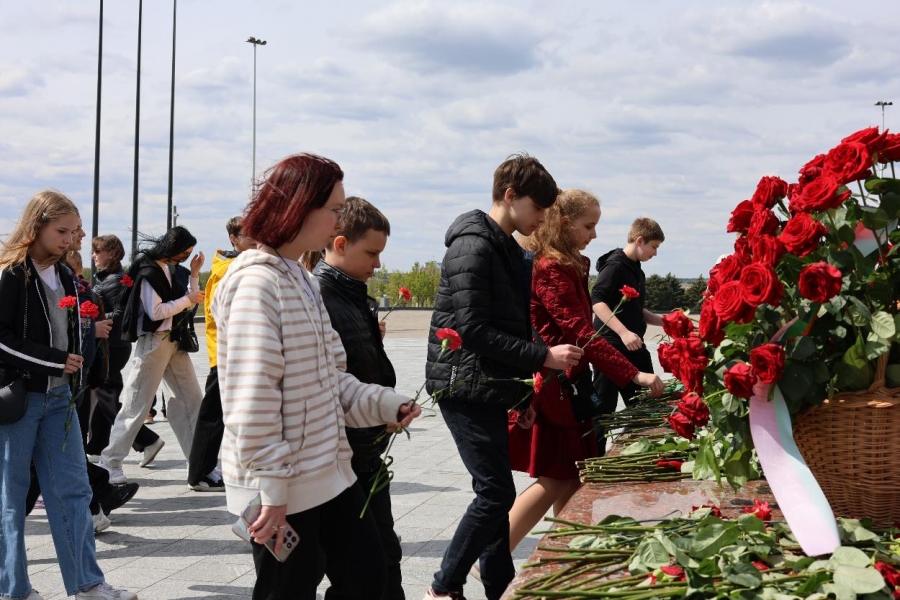 Первое, что сделали ребята – это возложили к мемориалу гвоздики, почтили память погибших воинов минутой молчания, а затем все как один поднялись по ступенькам на самый верх Кургана, посетили экспонаты военной техники времен Великой Отечественной войны и, конечно, запечатлели себя на фото.